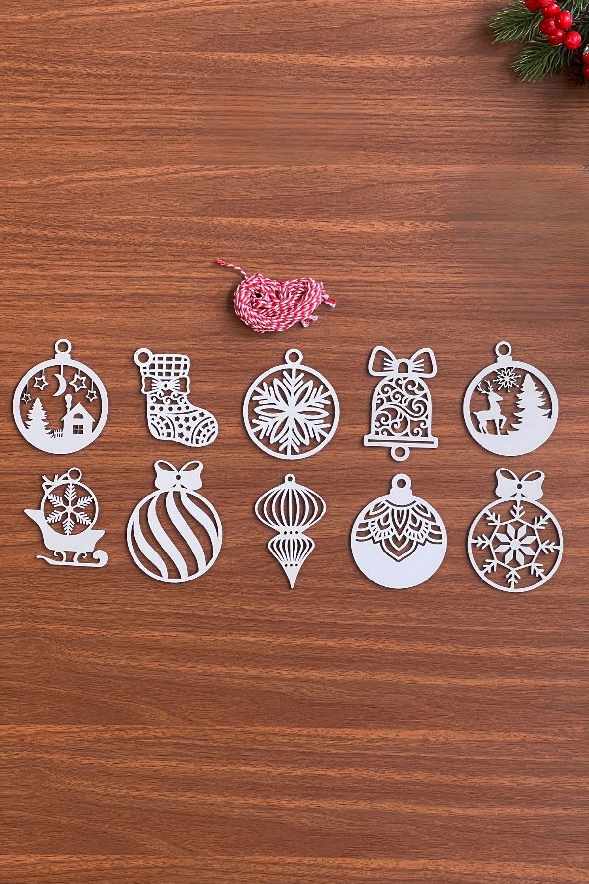 10 Parça Kırmızı Beyaz İpli Karışık Model Ahşap Yılbaşı Ağaç Süsü 🎄✨