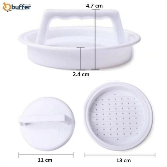 Hamburger ya da Köfte malzemelerini kalıbın içine ekleyin ve pres aparatıyla bastırınız Çok kolay bir şekilde köfte/hamburgeriniz şeklini alır ve pişirmeye hazır olur Afiyetle yiyebilirsiniz